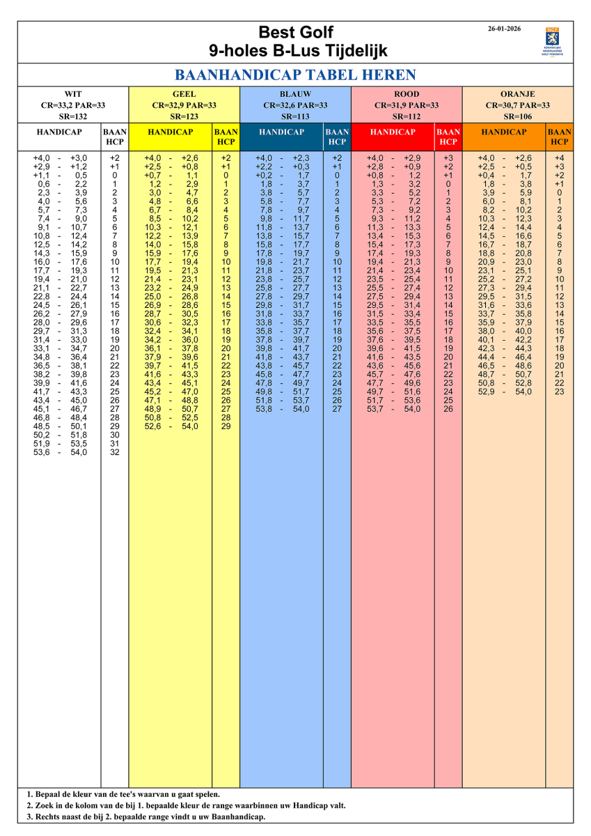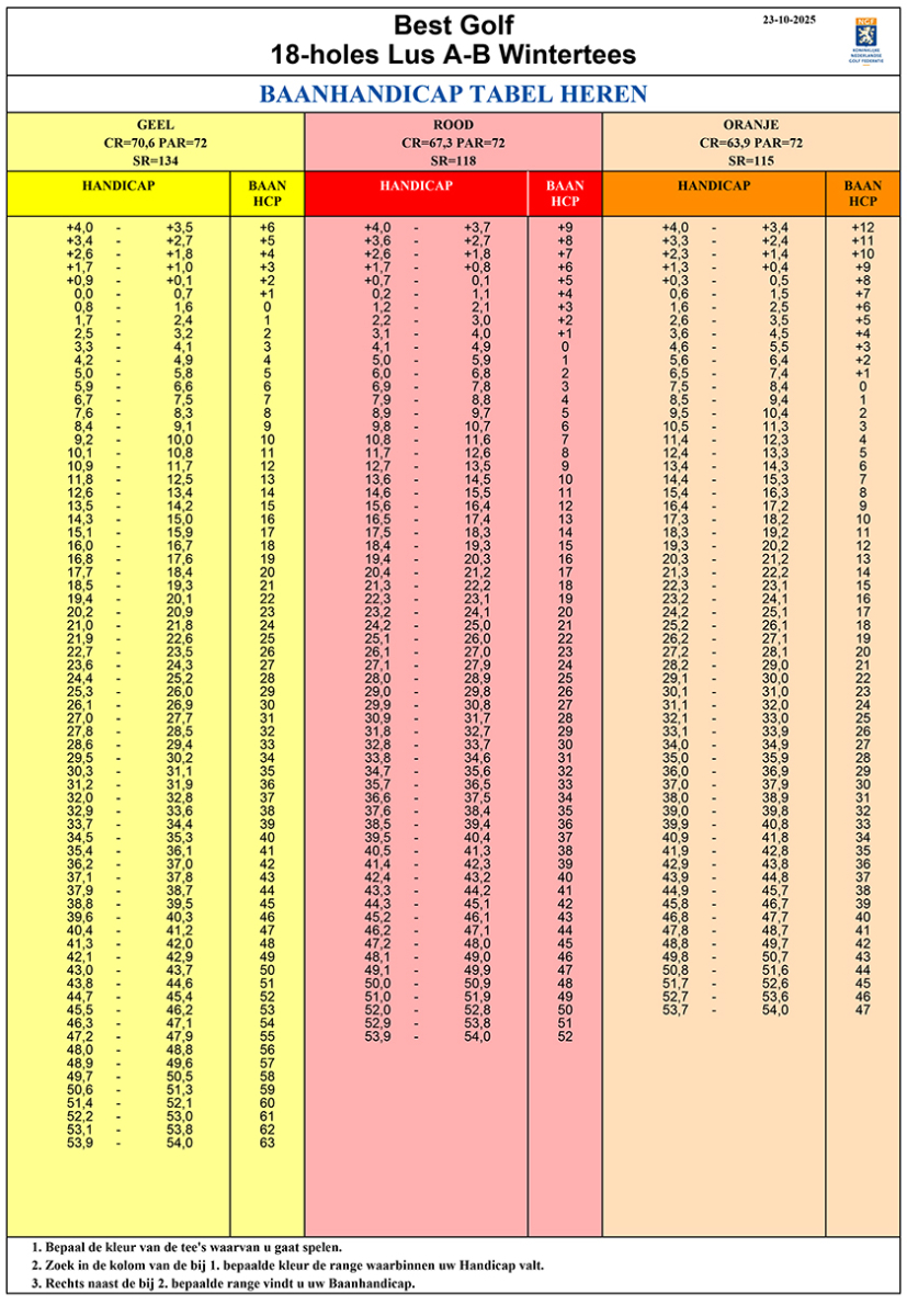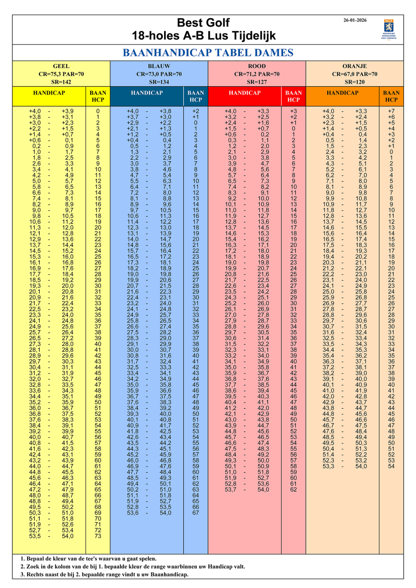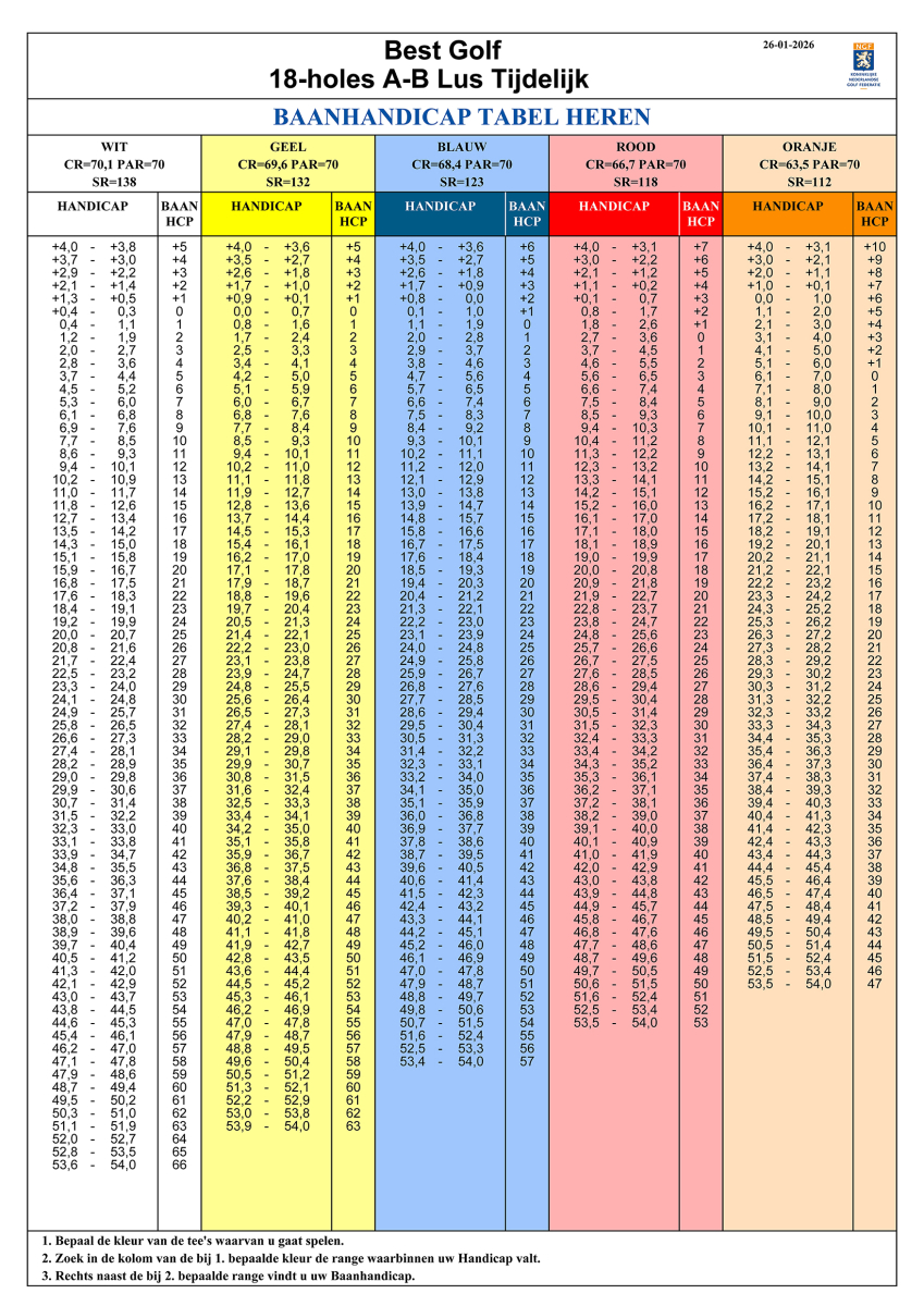Bereken hieronder uw 'playing handicap' voor de golfbaan van Best Golf