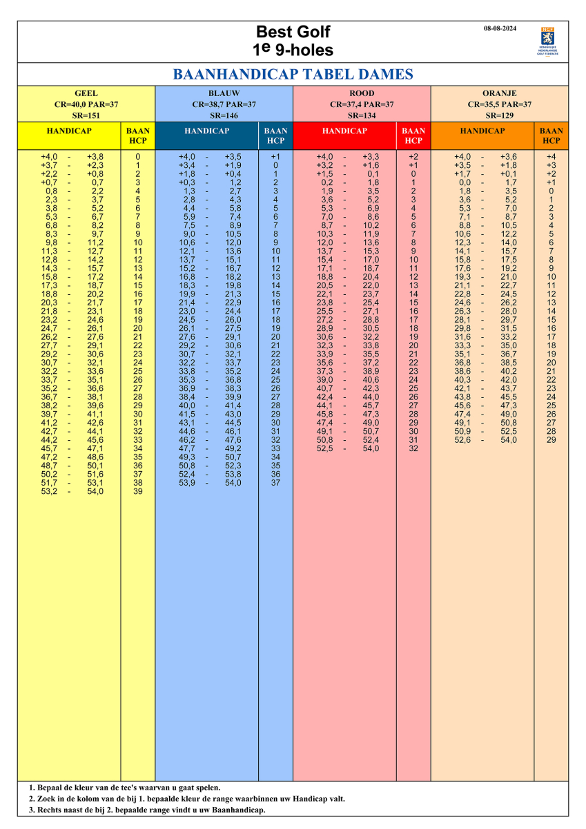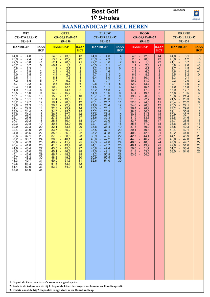 Bereken hieronder uw 'playing handicap' voor de golfbaan van Best Golf